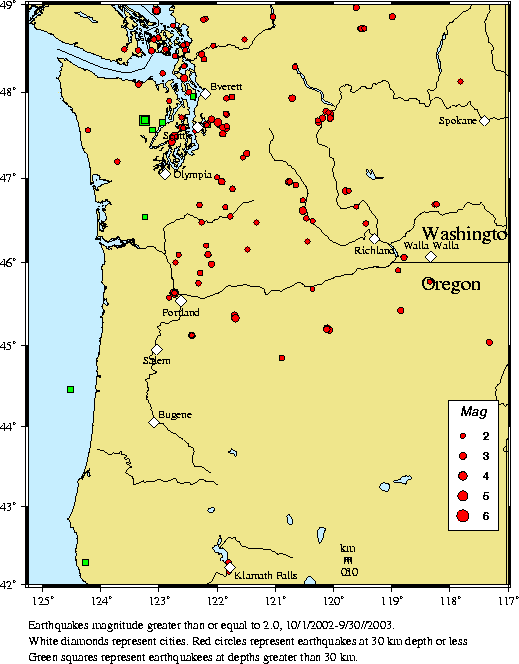 Figure 2. Earthquakes magnitude 2.0 or larger between Oct. 1, 2002 and Sept. 30, 2003. Locations