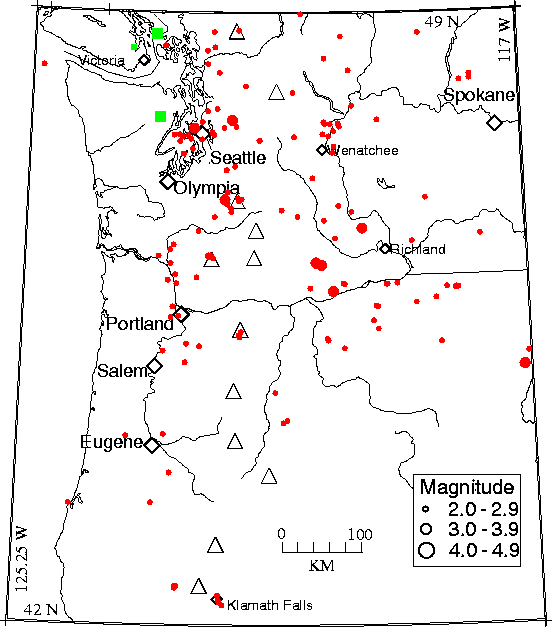 Figure 2. Earthquakes magnitude 2.0 or largerbetween Oct. 1, 1997 and Sept. 30, 1998. Locations